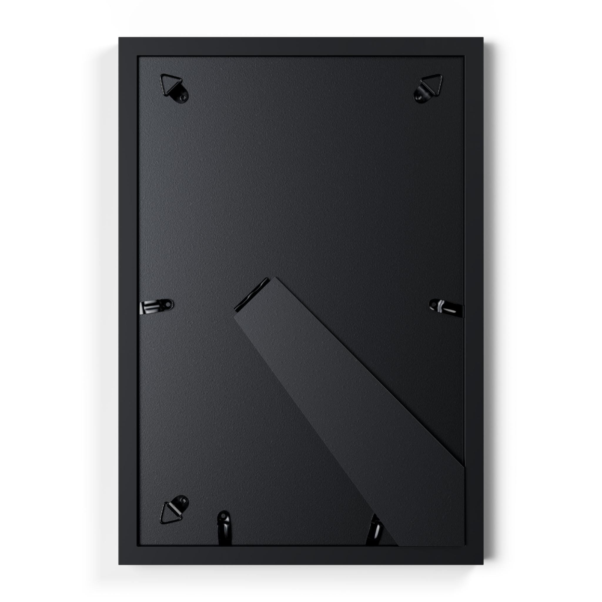 A framed poster that brings artwork to life with crisp, vibrant color and museum-style presentation. Each print is mounted behind a white matboard and covered with a clear Perspex panel, all set inside a sleek black MDF frame. The removable backing includes hanging loops and a built-in stand so you can display it on a wall or shelf. Choose from four sizes and horizontal or vertical layouts to suit your space. The result is a polished, ready-to-hang piece that elevates prints, illustrations, and photography while protecting them with durable materials.