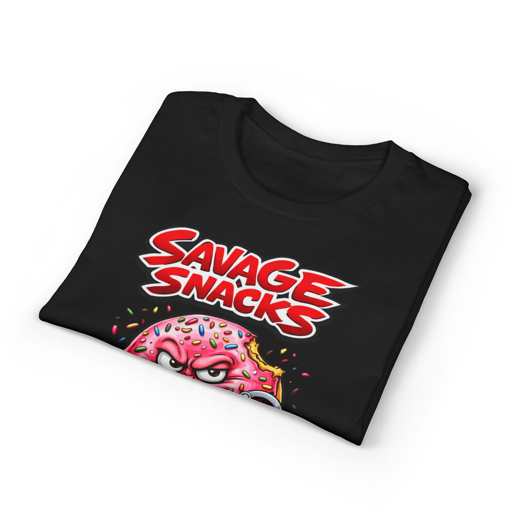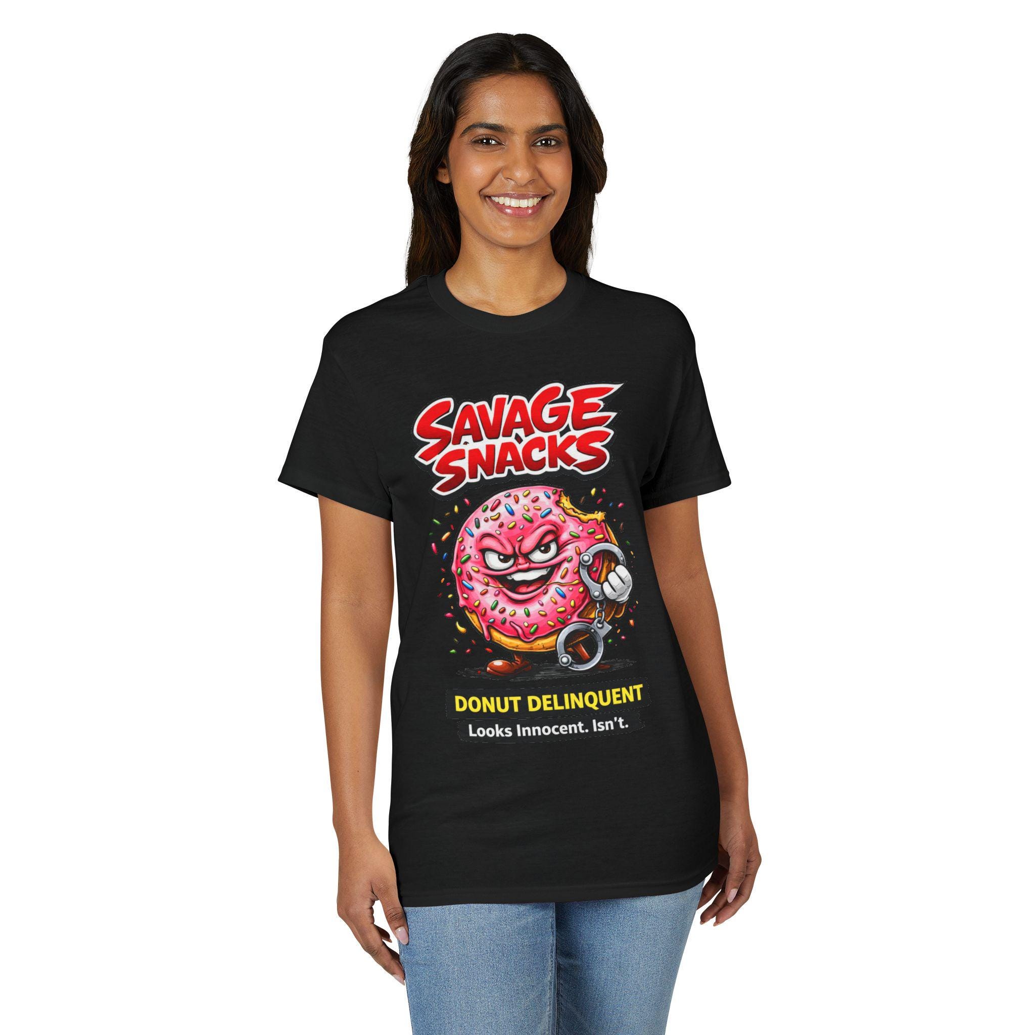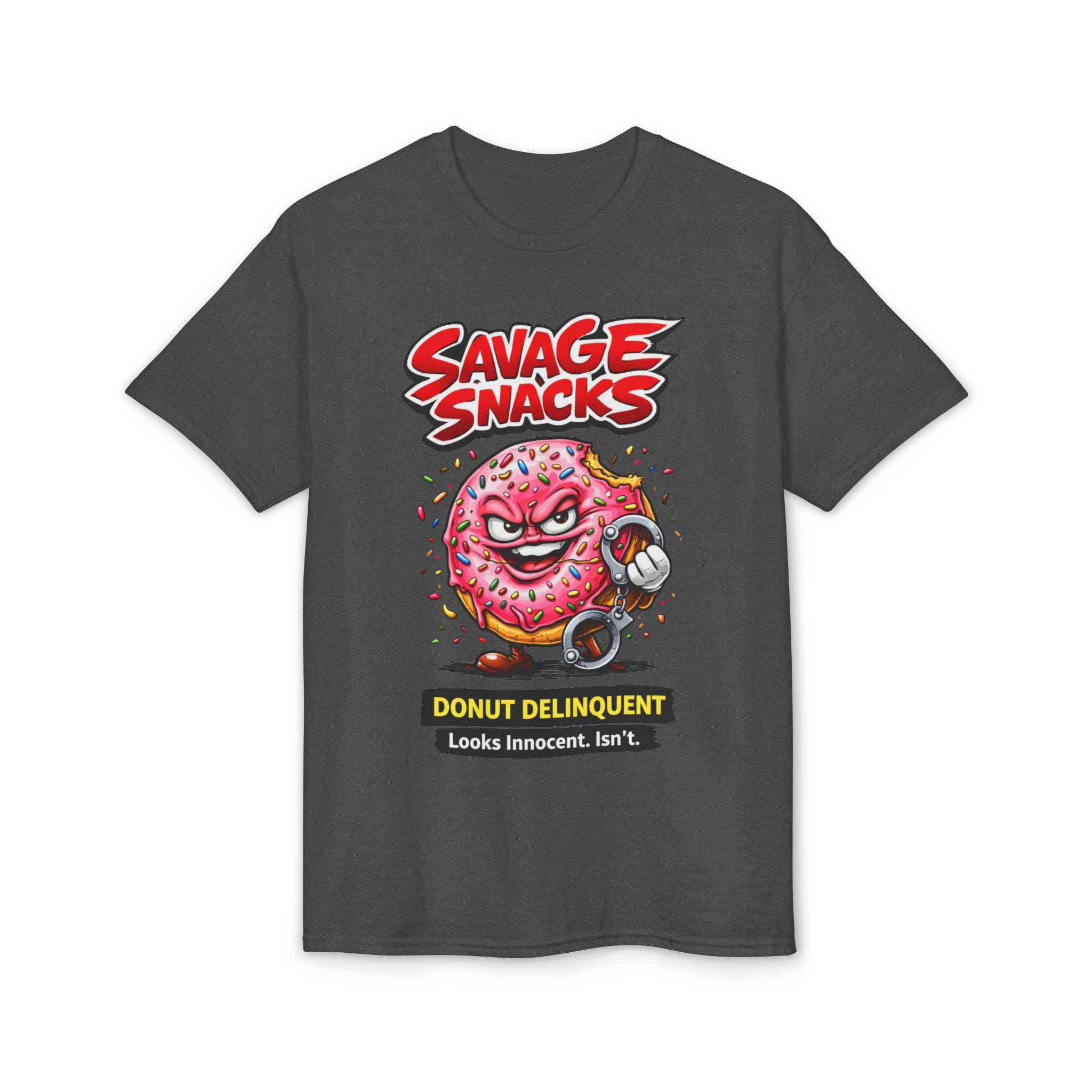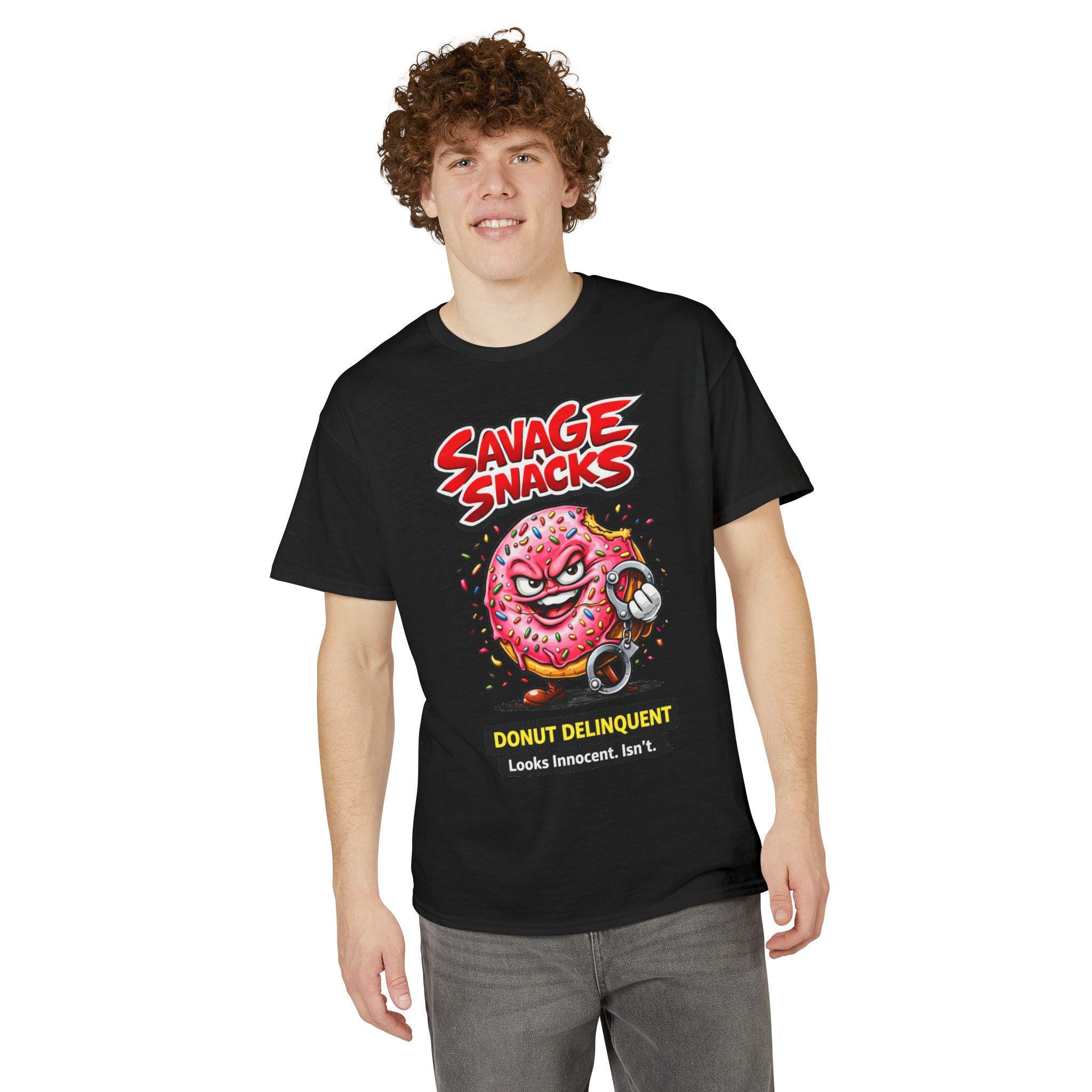 This bold tee puts playful mischief front and center. A punchy, cartoon-style donut character—sprinkled, grinning and ready to cause light-hearted trouble—sits beneath the punchy headline “Savage Snacks” and the subtitle “Donut Delinquent.” The graphic pops on a solid black background, with vivid reds, pinks, and neon accents that keep the energy high. The shirt feels lived-in yet durable thanks to a midweight knit and moisture-wicking DryBlend fabric, so you can wear the vibe all day without the cling. Wear it to skate parks, arcade nights, or casual hangouts to show off a cheeky sense of humor and a love for retro, graphic-driven streetwear.