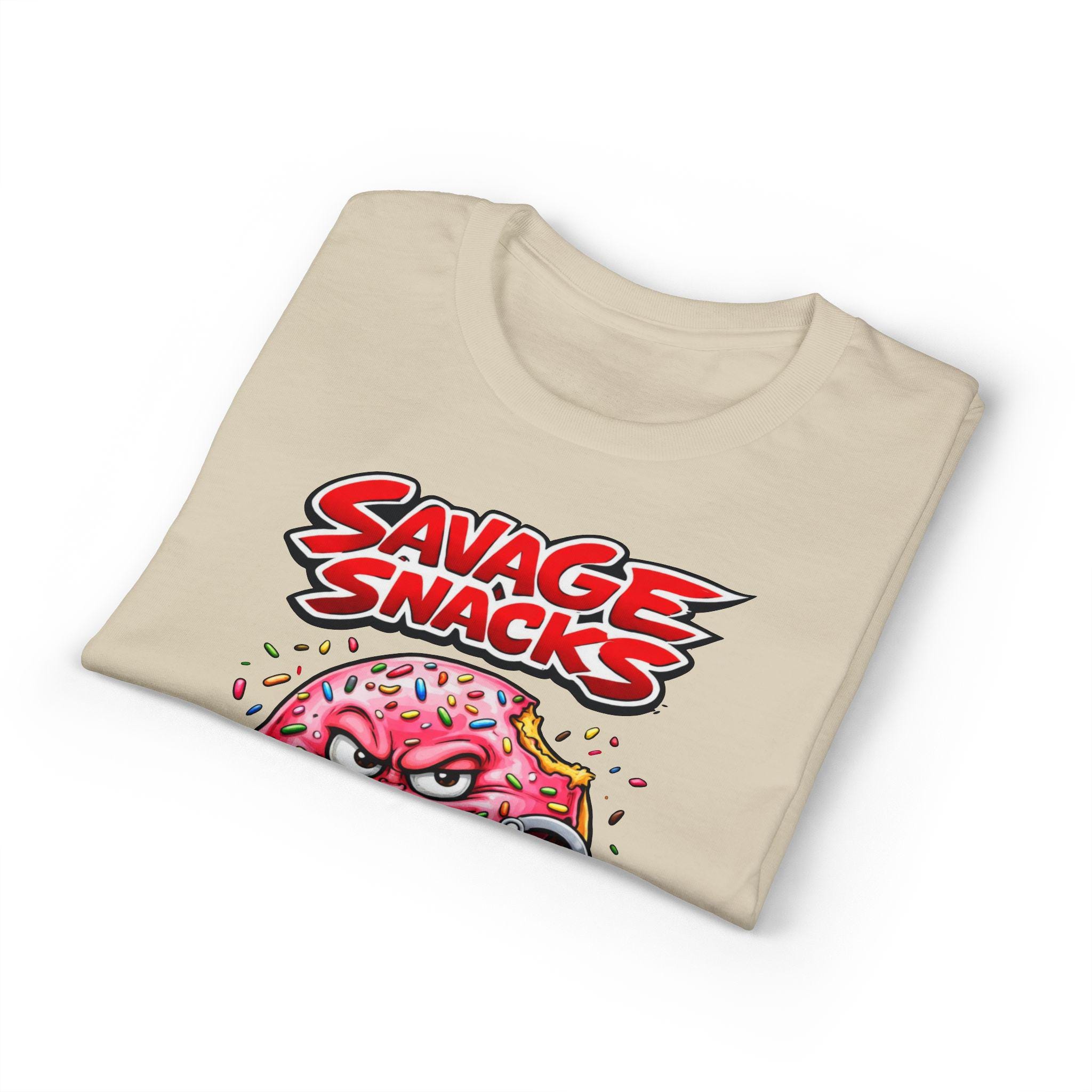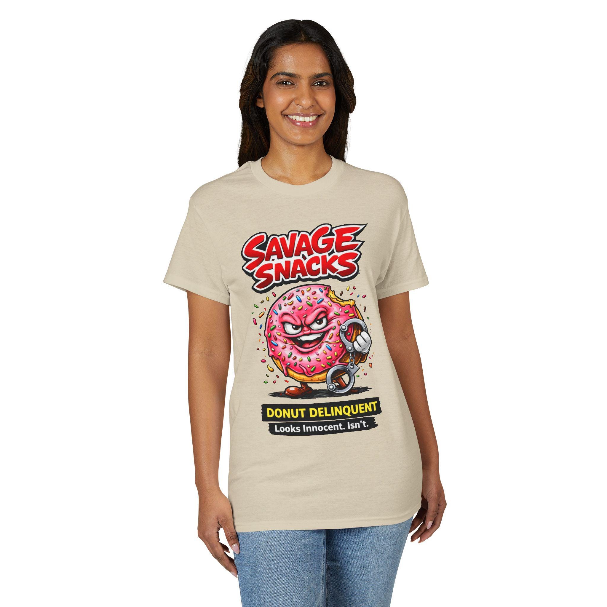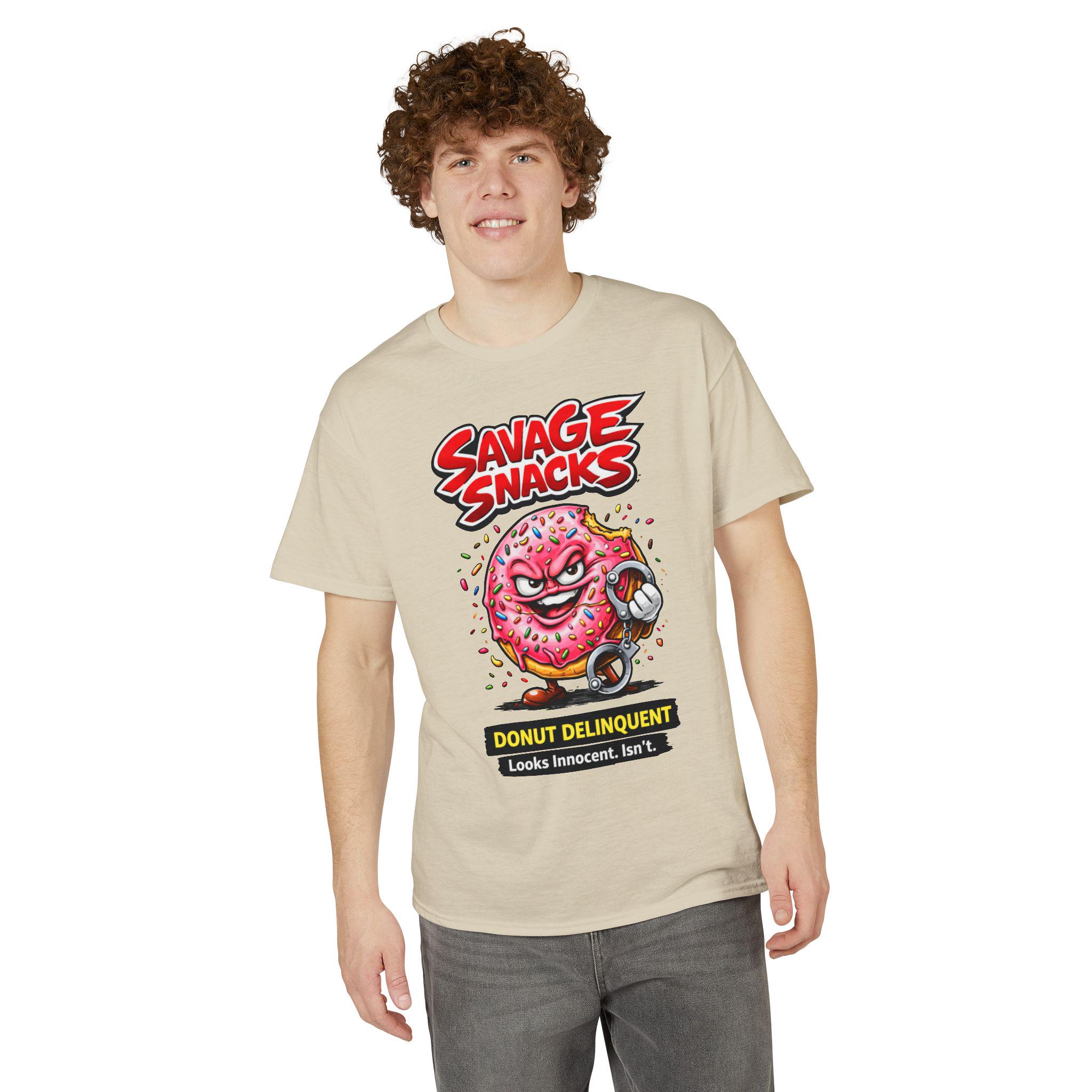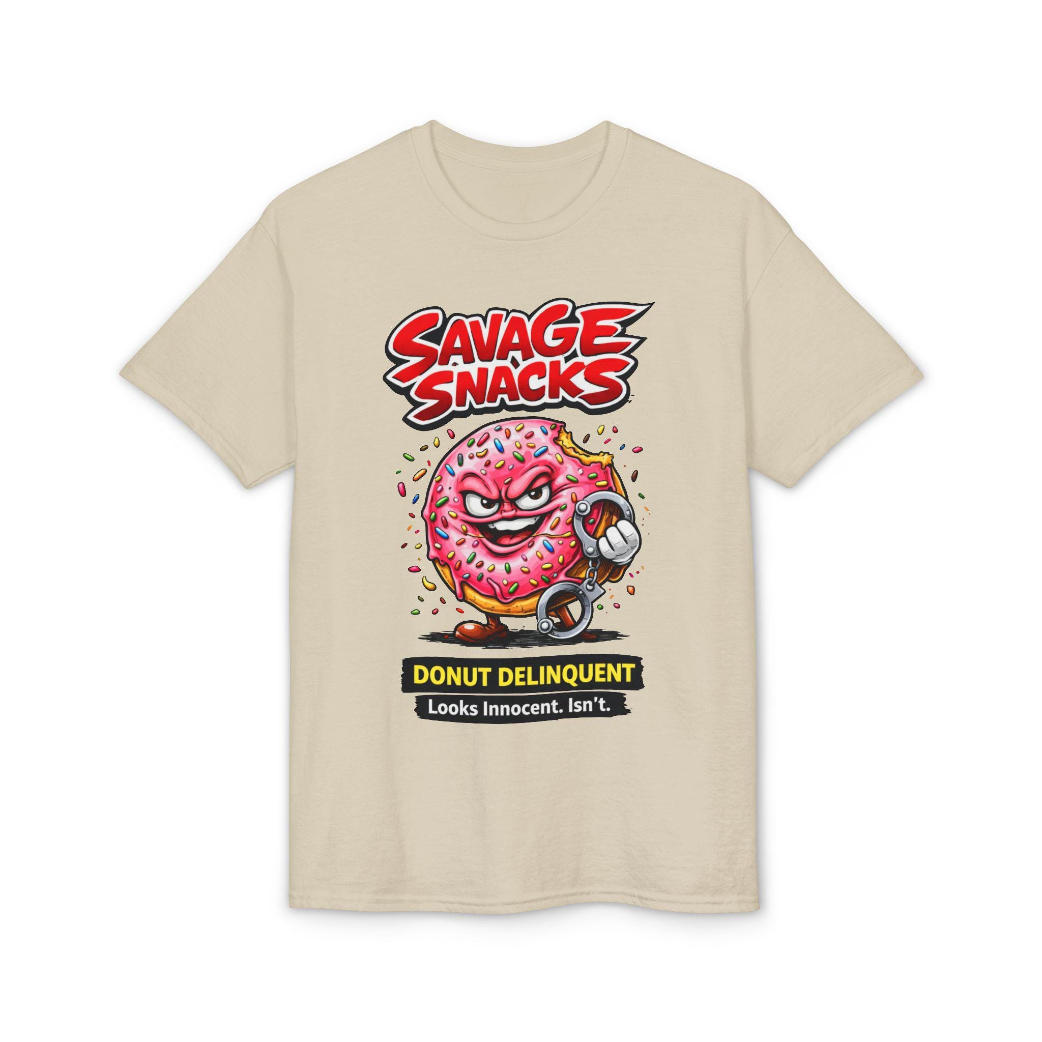 This bold tee puts playful mischief front and center. A punchy, cartoon-style donut character—sprinkled, grinning and ready to cause light-hearted trouble—sits beneath the punchy headline “Savage Snacks” and the subtitle “Donut Delinquent.” The graphic pops on a solid black background, with vivid reds, pinks, and neon accents that keep the energy high. The shirt feels lived-in yet durable thanks to a midweight knit and moisture-wicking DryBlend fabric, so you can wear the vibe all day without the cling. Wear it to skate parks, arcade nights, or casual hangouts to show off a cheeky sense of humor and a love for retro, graphic-driven streetwear.
